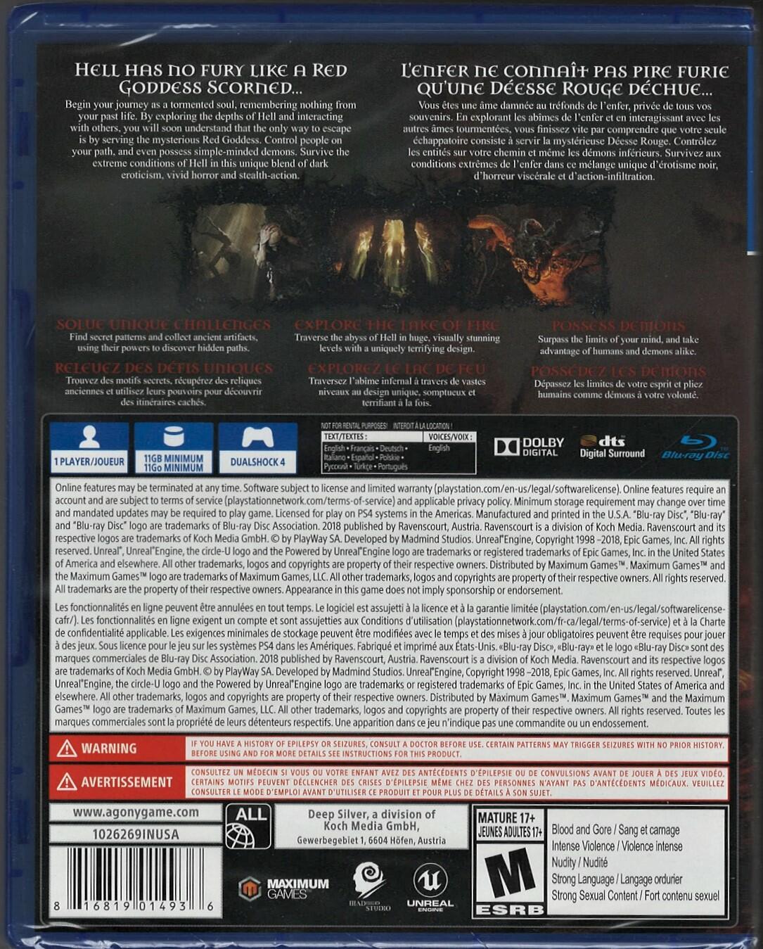 Agony is a first-person, survival horror game set in Hell. You will begin your journey as a tormented Soul within the depths of the Underworld, without any memories of your past. Equipped with the special ability to control people on your journey - even possessing demons themselves - you'll have all the necessary tools to survive in the extreme conditions of Hell.