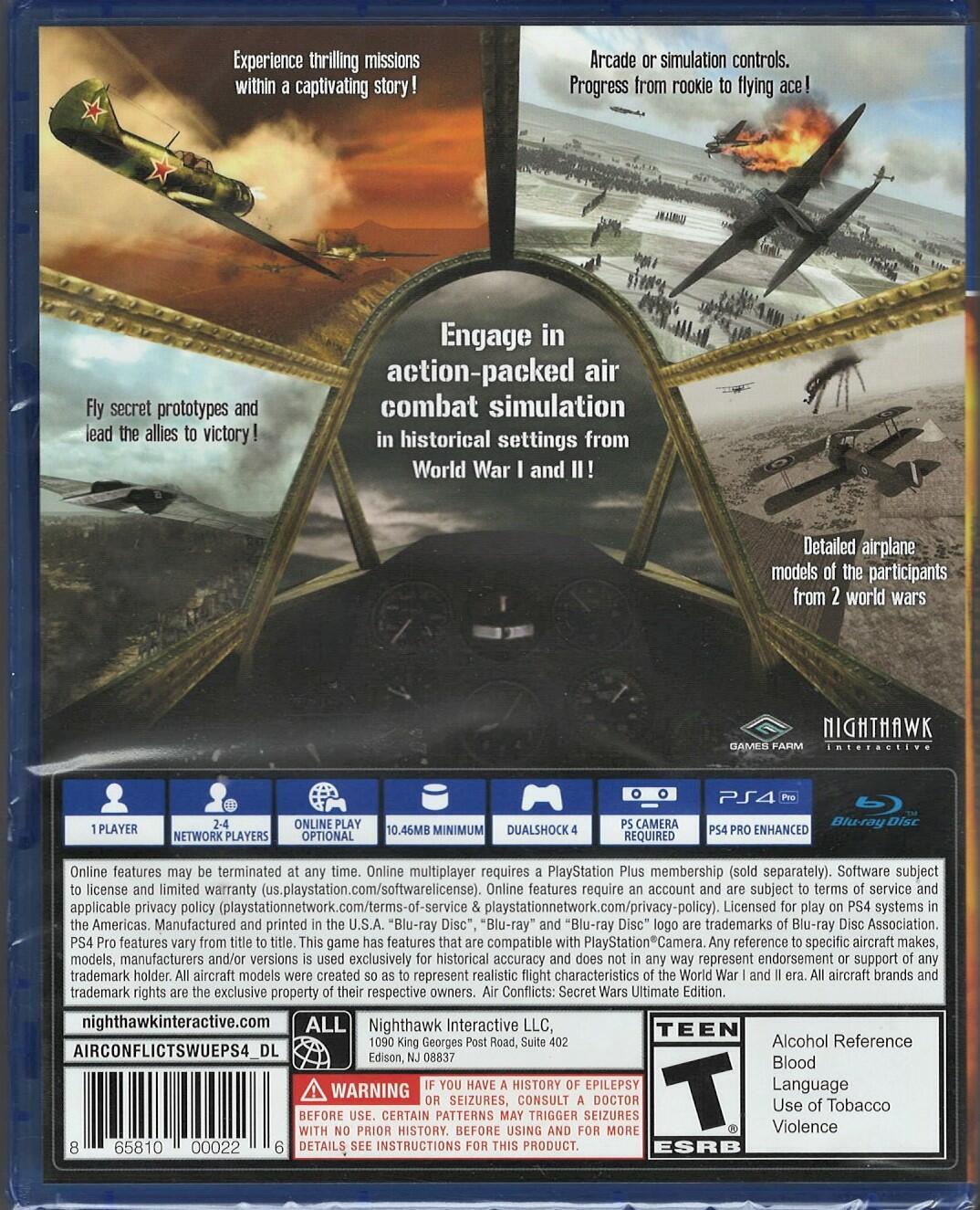 Air Conflicts: Secret Wars is an arcade flight simulation game that takes you right into the heart of the action, with air combat at historical locations set in World War I and II. Take to the skies in seven exciting campaigns with a total of 49 missions. Embark on escorting flights and patrols as well as defense, rescue and stealth missions. Fly more than 20 aircraft types from World War I and II. Test your mettle on your path from rookie to pro, picking between two difficulty levels as well as two game modes (arcade and simulation). In arcade mode, flight controls are simplified, while the simulation mode provides a more realistic experience. Show off your flying skills in the multiplayer mode, with up to eight players in five different modes. This Ultimate Edition offers much improved graphics, enhanced controls based on player feedback, and PS4 exclusive content.