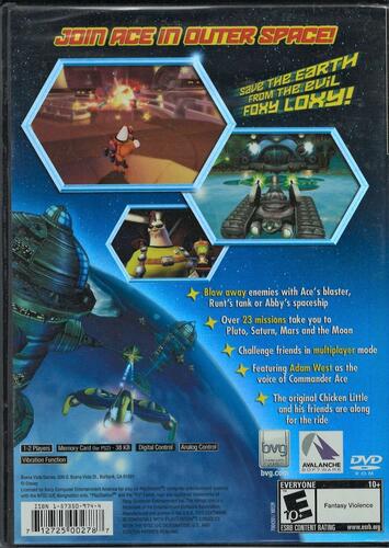 Inspired by the "superhero movie within the movie" finale of Walt Disney Pictures' film "Chicken Little," Disney"s Chicken Little: Ace in Action features Ace, the superhero alter ego of Chicken Little, and the Hollywood versions of his misfit band of friends: Runt, Abby and Fish-Out-of-Water. The crew of the intergalactic Battle Barn faces off against Foxy Loxy and her evil Amazonian sidekick, Goosey Loosey, who have an evil plan to take over Earth. Battle evil alien robots through multiple levels across the solar system and combat your foes in one of three distinct game play modes: Ace on foot as a soldier, Runt as the driver of an armored tank, or Abby as the pilot of a spaceship. The original Chicken Little and his friends Abby, Runt and Fish we know from the film are featured in cut scenes throughout the game.