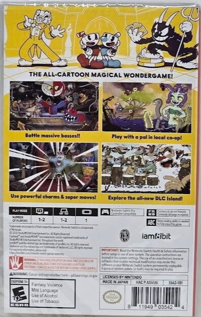 Come one, come all, to witness an interactive entertainment spectacle for the ages. Presenting…the all-cartoon Wondergame, Cuphead!! In this classic run and gun action game, play as brothers Cuphead or Mugman (in single player or local co-op) as you traverse strange worlds and take on massive, screen-filling bosses to earn your souls back from The Devil himself! It’s no exaggeration to say there really isn’t any other experience like this worldwide phenomenon from developer Studio MDHR. Inspired by cartoons of the 1930s, Cuphead’s visuals and audio are meticulously created with the same techniques of the era: traditional hand drawn cel animation, watercolor backgrounds, and original jazz recordings. Cuphead truly is a playable cartoon that feels plucked from the golden era of animation. But that’s not all! This rollicking retail edition includes the incredibly popular DLC expansion “The Delicious Last Course”, offering players a bevy of additional bosses, wondrous weapons & charms, and all-new playable character Ms. Chalice. Add in a set of delightful pack-ins lovingly crafted by the artists at Studio MDHR, and you get quite simply the most complete Cuphead experience ever, perfect for long-time fans and newcomers alike!
