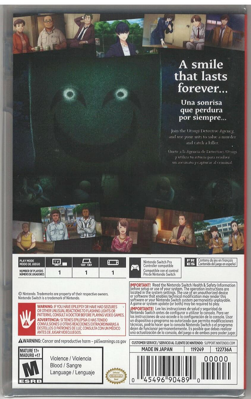 Investigate a brutal death and its connection to an urban legend. A student has been found dead! His head was covered with a paper bag with an eerie smiling face drawn on it—much like the victims of Emio, the Smiling Man—a killer of urban legend who is said to place such a bag over his victims’ heads. As an assistant private investigator, you are tasked with helping police solve this crime, which is reminiscent of a series of unsolved murders from 18 years ago. Has a serial killer returned, or is this the work of a copycat? Are these crimes inspired by the Smiling Man story, or the origin of it? Discover the answers to these questions and more as a member of the Utsugi Detective Agency in this intense story of suspicion, isolation, and fragility. Explore an interactive drama full of interesting characters. Continue the adventures of the Utsugi Detective Agency with the return of familiar characters—including the returning protagonist from previous games, and Ayumi Tachibana, who is now playable in certain sections of the game for the first time in the series! Warning: If you have epilepsy or have had seizures or other unusual reactions to flashing lights or patterns, consult a doctor before playing video games. All users should read the Health and Safety Information available in the system settings before using this software. A Nintendo Switch Online membership (sold separately) is required for Save Data Cloud backup.