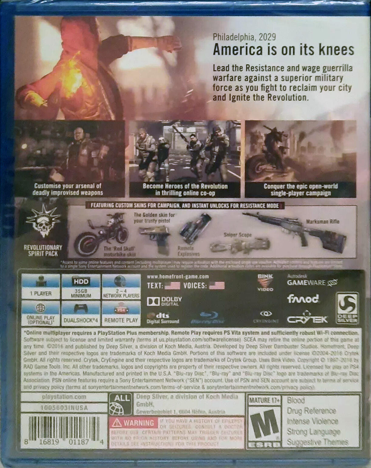 Homefront: The Revolution is the follow up to the commercially successful Homefront, and drops you into a world where the United States has been occupied for four years. Immerse yourself in high stakes gameplay where you must lead the resistance movement in tactical guerrilla warfare against a superior Korean People’s Army military force. A dynamic, responsive and visually striking open world responds to your actions - you and your resistance cell can inspire a rebellion on the streets and be the force that makes the critical difference in the war, turning occupation into revolution as oppressed civilians take up the fight. But your enemy has the advantage - superior technology, firepower, heavy armor and air support. You must learn the art of guerrilla warfare – ambush, sabotage, infiltration, deception – and fight a running battle through the war-ravaged suburbs of an occupied Philadelphia. And the single player campaign is just the start – an incredible Co-Op feature lets you and your friends form your own resistance cell and become renowned as Heroes of the Revolution.