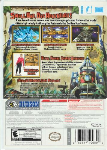 Anthony's quest for the Golden Sunflower! Set out upon an adventure with Anthony the Ant on his quest for the Golden Sunflower. Help guide Anthony¿s marble around the Ant World to gather essential items along the way in the ultimate goal to reach the Golden Sunflower and save his colony. Face treacherous mazes, use awesome gadgets and balance the world (literally) with fun and intuitive controls only available on Wii. Customization: 1. Design your ball: Use upgrades to help you navigate through stages, place your Mii inside of the marble and watch him or her roll, or select preset fun avatars including rolling UFOs complete with shrieking Aliens in them. 2. Can¿t get enough of the game? Edit Mode allows you to design your own unique stage. Design it any way you would like and play it over and over. Wi-Fi: 1. Wii Connect 24: After you are done creating and playing your own stages, share them with your friends through Wii Connect 24. 2. The Story Lives On: Receive extra stages from Hudson after launch via the Nintendo Wi-Fi Connection. 3. Wi-Fi Leaderboards: Compete online against other players over who can navigate throughout the world the fastest. Wii Balance Board: Be the Ball using the Balance Board. Widgets and More Widgets: 40 different widgets to help guide your marble including magnets, cannon vaults, shrinking machines, acceleration tubes, movable bridges, and much more. Four Person Multiplayer: Play with three other people on the same map as you race to the finish line.