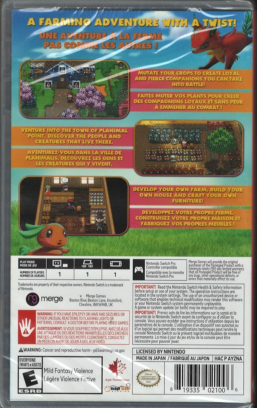 A farming adventure with a twist! Get ready to set out on an adventure of a lifetime as you start a new life in planimal point. Develop your own farm, build, and customize your own house, craft your own furniture, make some delicious jams and mutate your crops to create loyal and fierce companions you can take into battle! During your journey through planimal point you'll discover strange slimes which can mutate your crops in ways you would never have imagined! Depending on the Season, the slime or the CROP you mutate, you'll be able to create up to 72 different Mutations! Planimals are loyal mutated crops that stay by your side through thick and thin. They'll be a key companion to you as you adventure across planimal point, taking part in thrilling turn-based battles and exploring dungeons as you try to bring down the evil slimeco. Whatever the Weather!