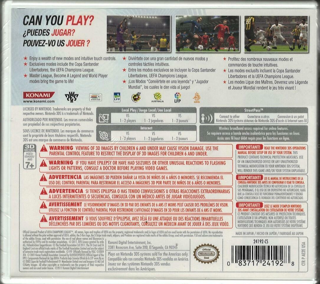 Pro Evolution Soccer 2012 is the 2011-2012 version of Konami's popular, video game soccer franchise. The eleventh release in the series overall, Pro Evolution Soccer 2012 takes digital soccer to the next level by providing a wide range of game improvements over earlier game editions to create the best and most realistic soccer game available to date. Features include: improved teammate AI that shows itself both on offense and defense, new off-the-ball controls, challenging defensive assignments, a collision detection overhaul and improved graphics. Pro Evolution Soccer makes its return in fall 2011 with Pro Evolution Soccer 2012. In this edition, Konami is determined to give global football fans a truly realistic, immersive and a delightfully playable take on the beautiful game. Creative Producer Shingo "Seabass" Takatsuka has been sourcing the desires of fans across the globe and working nonstop on marrying the digital game to the real life game so fans can get as close to the real thing. All elements have been examined - defense, offense, AI, penalties, officiating and of course, graphics. The result is a game that truly represents the key attributes of the game and it's players. Pro Evolution Soccer "Can you play?" Updated Graphics - Movements, facial representations and pitches have built upon last year's massive improvements