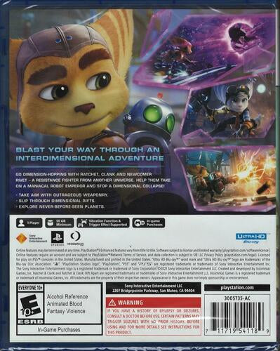 The intergalactic adventurers are back with a bang. Help them stop a robotic Emperor intent on conquering cross-dimensional worlds, with their own universe next in the firing line. Blast your way home with an arsenal of outrageous weaponry. Experience the Shuffle of dimensional Rifts and dynamic gameplay. Explore never-before-seen planets and alternate dimension versions of old favorites. PS5 features: feel in-game actions through the haptic feedback of the dual sense wireless Controller. Take full control of advanced weapon mechanics, made possible by adaptive triggers. Planet-hop at hyper-speed via the near-instant loading of the PS5 console's SSD. Immerse your ears with Tempest 3D audio Tech as you work to save the universe. Enhanced lighting and rays tracking render dazzling in-game worlds - displayed in crisp, dynamic 4K and HDR. Choose performance mode to enjoy targeted 60 frames per second gameplay. (With compatible headphones. Dynamic 4K and HDR require a compatible 4K and HDR compatible TV or display.)