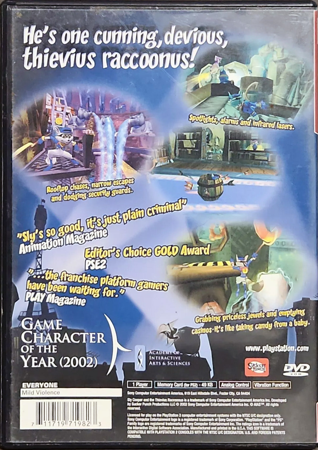 Sly Cooper and the Thievius Racoonus puts the player in the role of a raccoon named Sly Cooper. On Sly's eighth birthday, he is given the Thievius Raccoonus, an instruction manual passed down through the Cooper family for generations on how to be a great thief. But ruthless villains bust in and steal the manual, split it amongst themselves, and then vanish. Sly, along with his two friends Bentley and Murray, must embark on a platform adventure to recover the pages of the book and prove to the world that Sly Cooper is the world's greatest thief. Different skills, such as stealth tactics and platform jumping, are required throughout the game. You'll also pilot vehicles, play minigames, and fight bosses as you proceed.