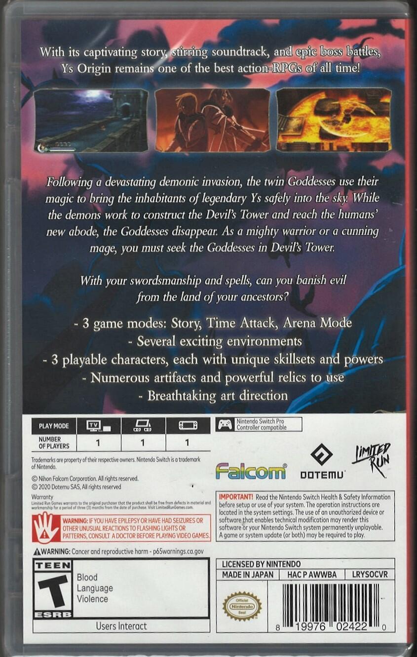 Enter the World of Ys and discover one of the greatest japanese A-RPG of all time. Following a devastating demonic invasion, the twin Goddesses use their magic to bring the inhabitants of legendary Ys safely into the sky. While the demons work to construct Devil's Tower and reach the humans' new abode, the Goddesses disappear. As a mighty warrior or a cunning mage, you must seek the Goddesses in Devil's Tower. With your swordsmanship and spells, can you banish evil from the land of your ancestors? FEATURES: - 3 playable characters, each with unique skillsets and powers - Several exciting environments - 4 game modes: Story, Time Attack, Arena Mode and a Speedrun Mode - A Blood Level Option - Numerous artifacts and powerful relics to use - Breathtaking art direction. With its captivating story, stirring soundtrack, and epic boss battles, Ys Origin remains one of the best action-RPGs of all time!